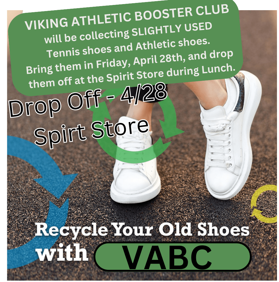 VIKING ATHLETIC BOOSTER CLUB will be collecting SLIGHTLY USED Tennis shoes and Athletic shoes. Bring your shoes in Friday April 28th, 2023 and drop them off at the Spirit Store During Lunch.